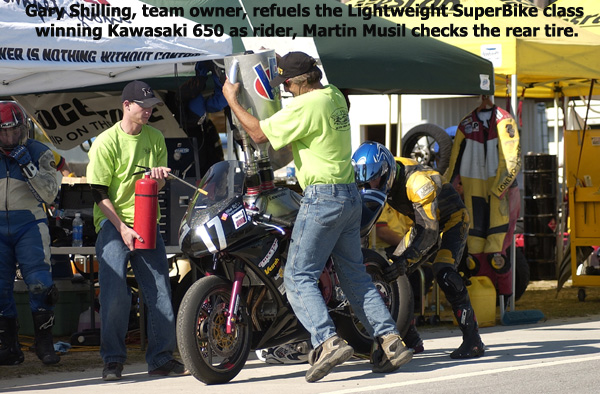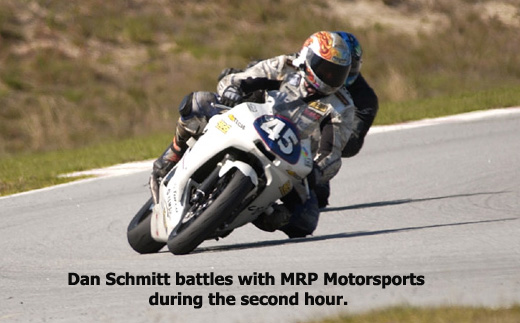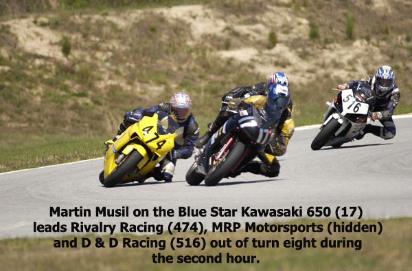 minutes to get some more great video footage. Red Star was flying but they had to make up a lap to catch Vesrah. 5150 gained another lap on Velocity and Triple R finally got by Dalke. Blue Ridge put a lap on Neighbor, looking for the first ‘national win’ for the Kawasaki 650. Honda mounted Team HMR and two of the Wizard Racing bikes maintained their top ten standing to the end.