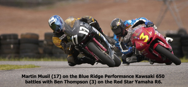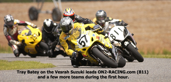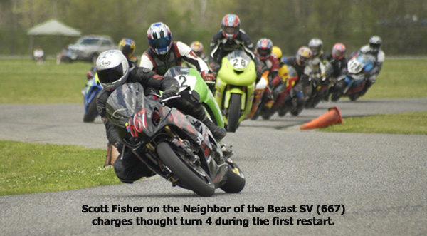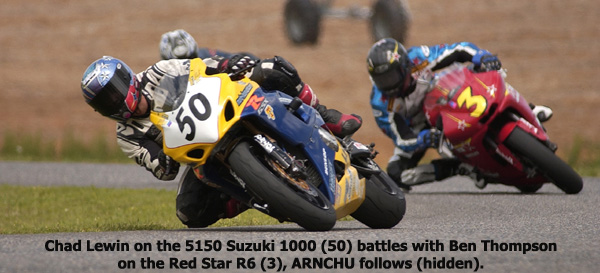 Chad Lewin on the 5150 Racing Suzuki 1000 took the lead with Tray Batey on the Nielson Enterprise/Vesrah Suzuki running second. Red Star, Team Velocity, Triple R Racing, TVR II and Dalke Motorsports followed. In the very competitive Lightweight class, Ghetto Customs, Neighbor of the Beast and Blue Ridge Performance ran one,two,three.